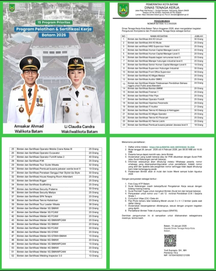 Program ini menjadi bagian dari 15 Program Prioritas ASLI (Amsakarโ€“Li Claudia) untuk memperkuat daya saing tenaga kerja Batam sebagai kota industri dan lokomotif ekonomi nasional.