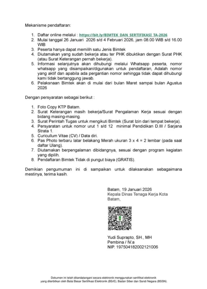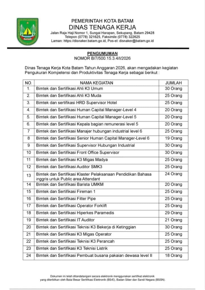 Sebagai gambaran, sepanjang 2025 Disnaker Batam telah menggelar 83 program pelatihan dengan 3.449 peserta pencari kerja. Selain itu, terdapat 53 program bimtek sertifikasi yang diikuti 1.396 pekerja aktif.
