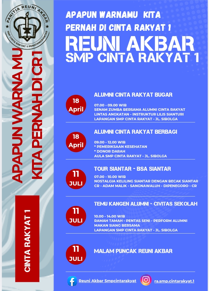 Moranews Pematangsiantar — Alumni SMP Cinta Rakyat (CR) 1 Pematangsiantar akan menggelar Reuni Akbar dalam menjaga kebersamaan dan mempererat tali silaturahmi,Sabtu(11/7)