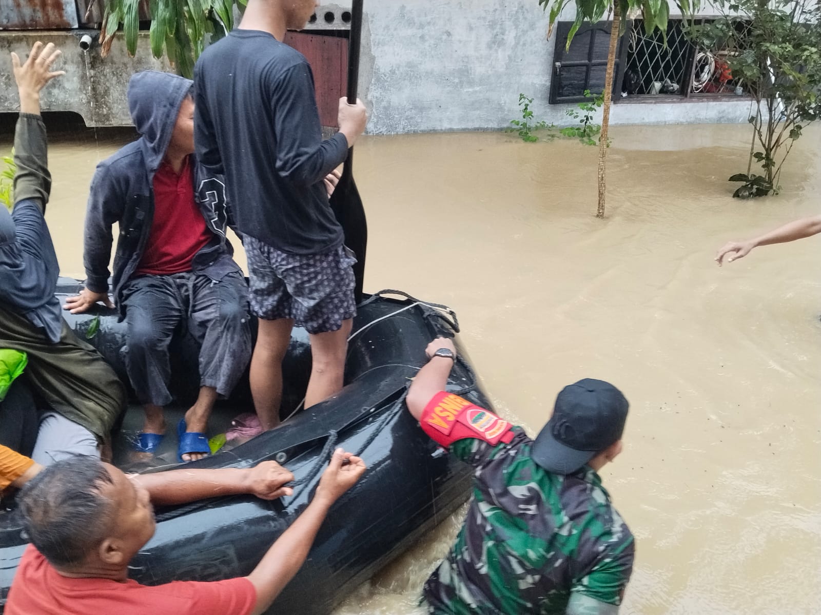 Beberapa warga terlihat berpegangan di sisi perahu, sementara lainnya dievakuasi ke tempat yang lebih aman. Curah hujan yang masih tinggi tak menghalangi tim untuk terus melanjutkan penyelamatan.