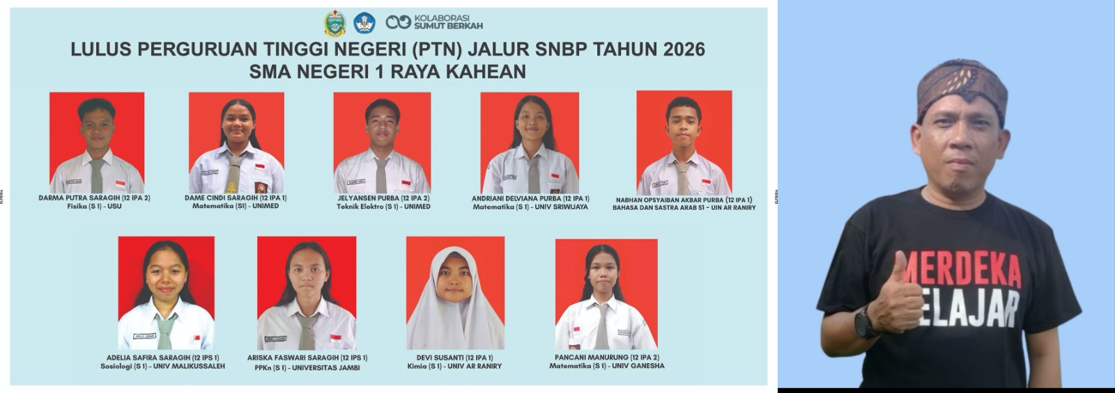 Dame Cindi Saragih, Matematika (S1), Universitas Negeri Medan. Jelyansen Purba, Teknik Elektro (S1), Universitas Negeri Medan. Adriani Delvana Purba, Matematika (S1), Universitas Sriwijaya. Nabhan Obsyaiban Akbar Purba, Bahasa dan Sastra Arab (S1), UIN AR RANIRY. Adelia Safira Saragih, Sosiologi (S1), Universitas Malikussaleh. Ariska Faswari Saragih, PPKn (S1), Universitas Jambi. Devi Susanti, Kimia (S1), UNIV AR RANIRY. Pancani Manurung, Matematika (S1), Universitas Ganesha.