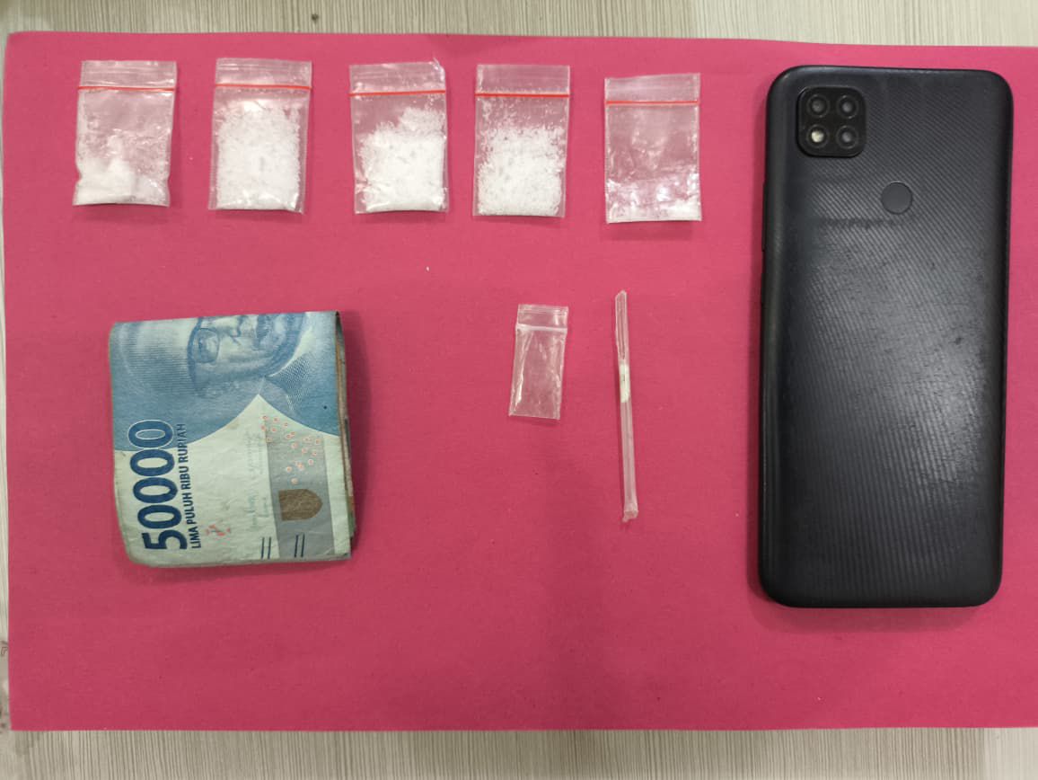 Saat dilakukan penggeledahan di dalam kamar, polisi menemukan lima paket sabu siap edar dengan berat mencapai 4,39 gram. Selain itu, turut diamankan satu plastik klip kosong, satu pipet berbentuk skop, satu unit handphone, serta uang tunai Rp150 ribu yang diduga hasil penjualan narkoba.
