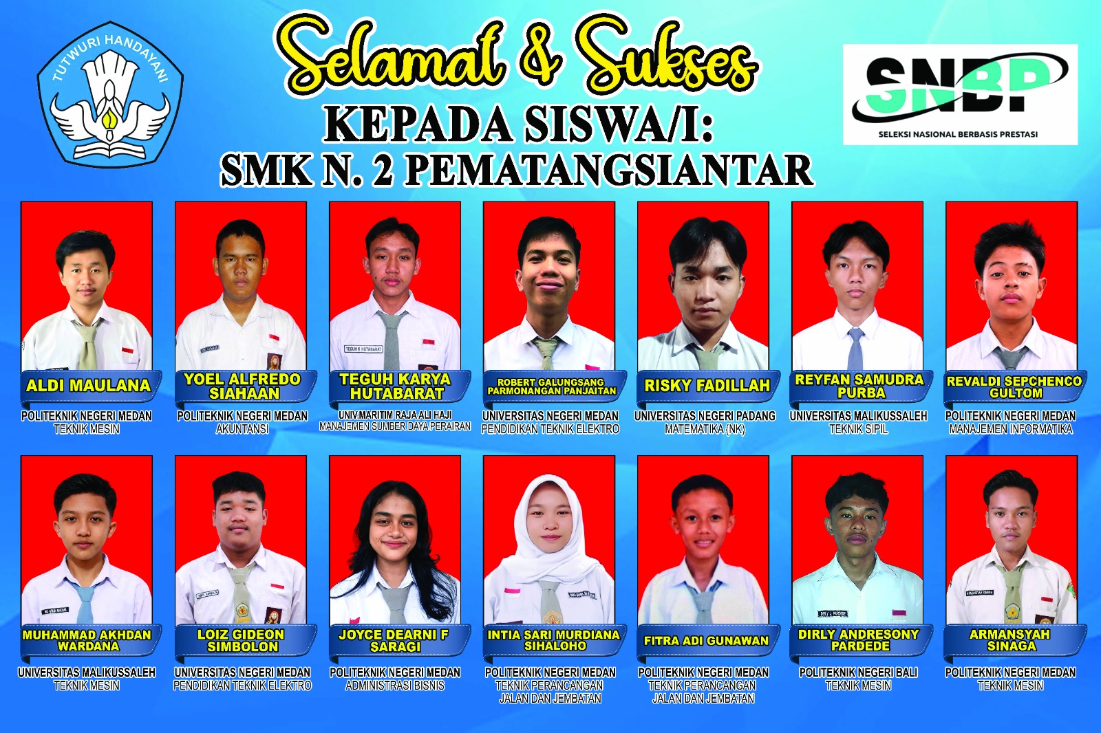Muhammad Akhdan Wardana, Teknik Mesin, Investasi Malikussaleh. Lois Gideon Simbolon, Pendidikan Teknikal Elekro, Universitas Negeri Medan. Joyce Dearni F Saragi, Administrasi Bisnis, Politeknik Negeri Medan. Intia Sari Murdiana Sihaloho, Teknik Perancangan Jalan dan Jembatan, Politeknik Negeri Medan. Fitra Adi Gunawan, Teknik Perancangan Jalan dan Jembatan, Politeknik Negeri Medan. Dirly Andresony Pardede, Teknik Mesin, Politeknik Negeri Bali. Armansyah Sinaga, Teknik Mesin, Politeknik Negeri Medan.