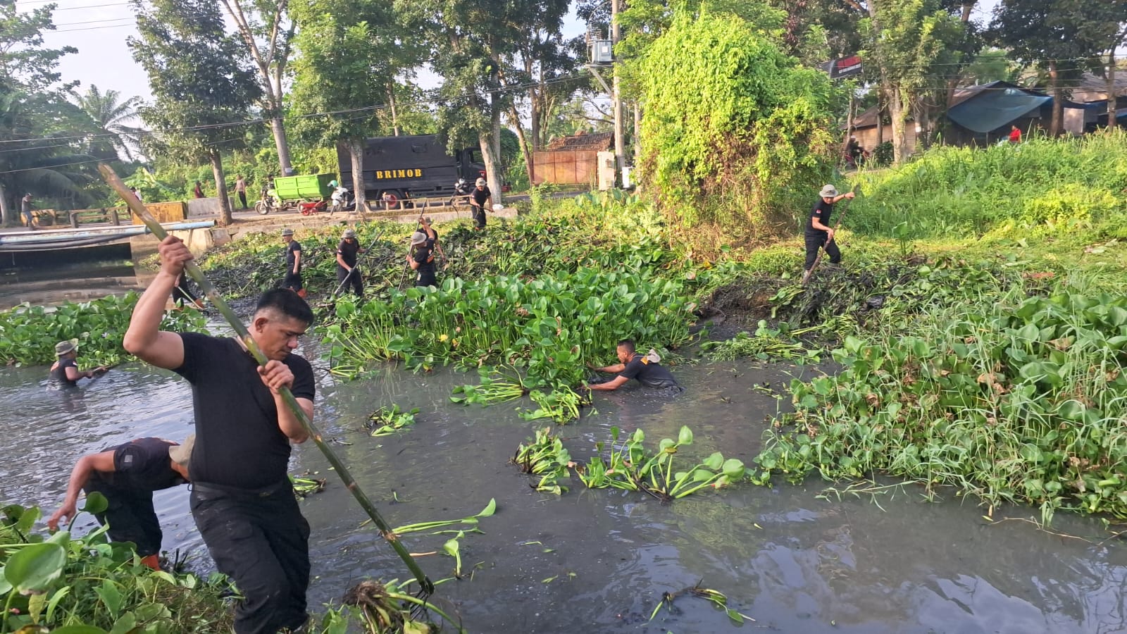 Moranews Tanjung Balai — Personil Brimob Kompi 3 Yon B Sat Brimob Polda Sumut membersihkan kawasan aliran sungai dalam rangka mendukung program Presiden RI, Bapak Prabowo Subianto yakni Gerakan Indonesia ASRI (Aman, Sehat, Resik, Indah).