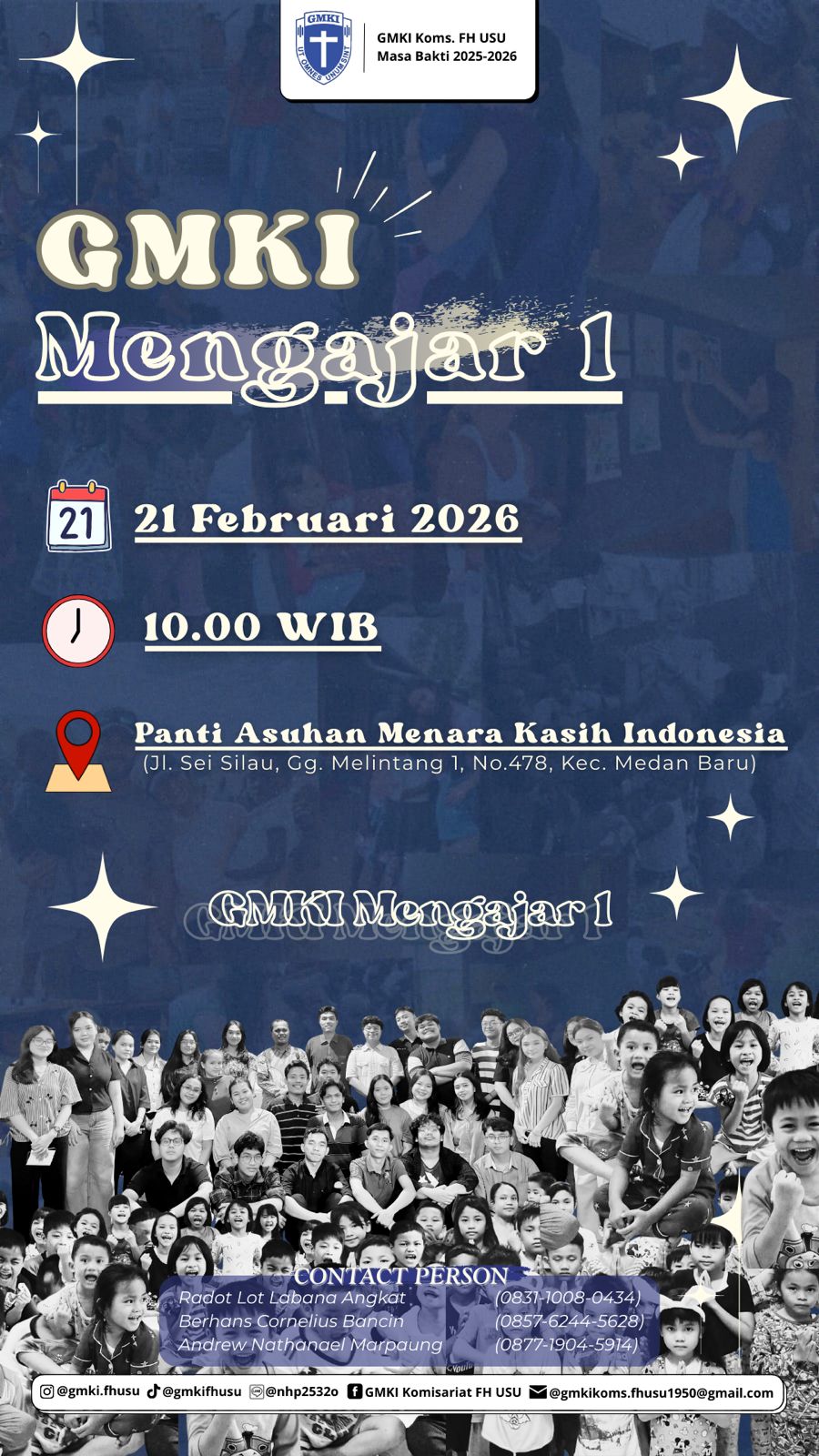 Moranews Medan – Gerakan Mahasiswa Kristen Indonesia (GMKI) Komisariat Fakultas Hukum Universitas Sumatera Utara (FH USU) melaksanakan program “GMKI Mengajar 1” di Panti Asuhan Menara Kasih Indonesia yang beralamat di Jl. Sei Silau, Gg. Melintang 1, No. 478, Kecamatan Medan Baru, pada Sabtu (21/02/2026).