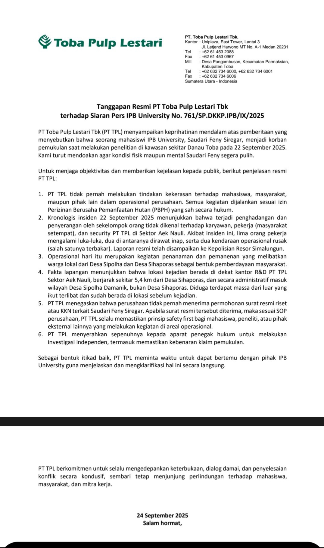 Dalam siaran pers resmi PT TPL, yang dikeluarkan, Rabu (24/9/2025) mengungkapkan, keprihatinan mendalam atas pemberitaan yang menyebutkan bahwa seorang mahasiswi IPB University, Saudari Feny Siregar yang diduga menjadi korban pemukulan saat melakukan penelitian di kawasan perusahaan di sekitar Danau Toba.Pihak Managemen telah melaporkan kejadian secara resmi ke Kepolisian Resor Simalungun.