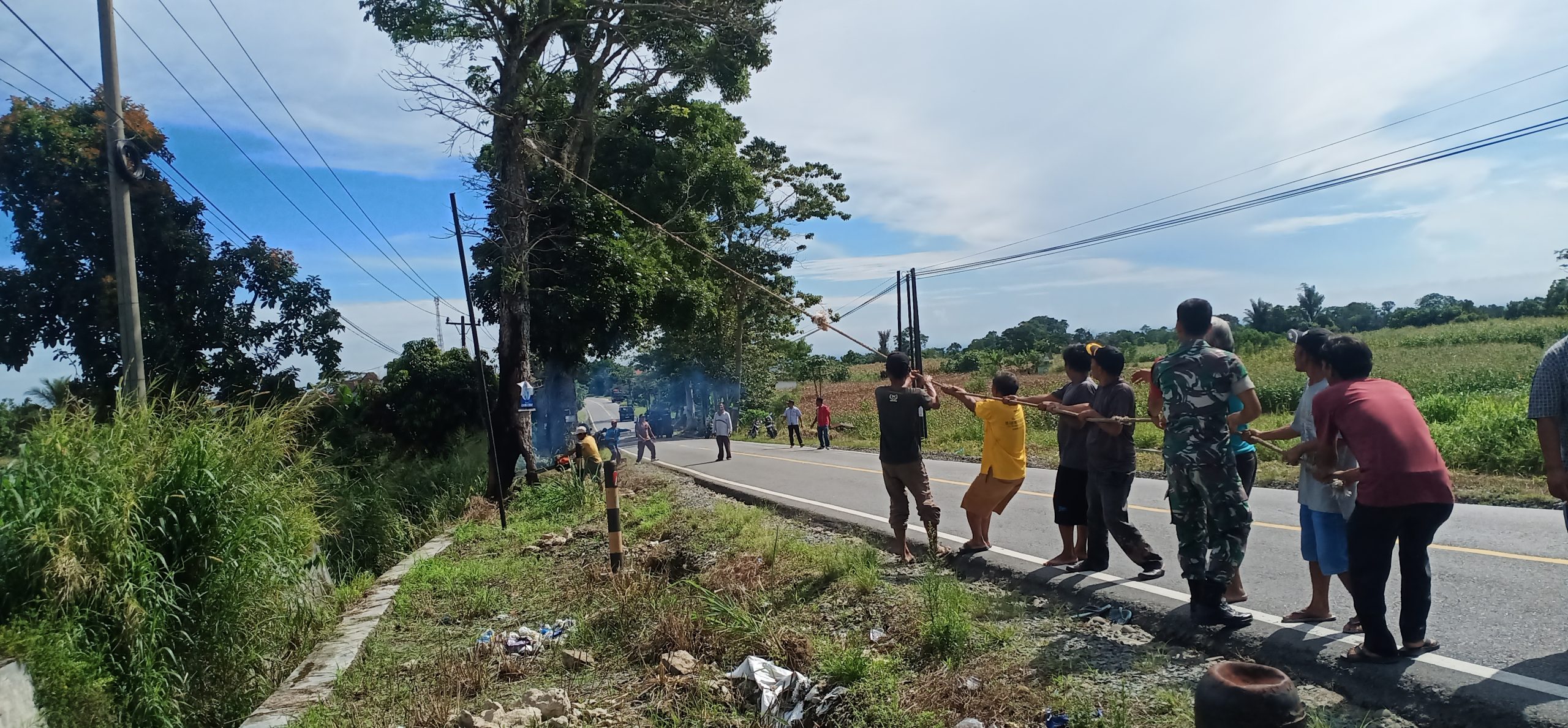 Forkopimcam Dolokpanribuan menebang pohon mahoni di Jalinsum Parapat wilayah Kecamatan Dolokpanribuan, Kabupaten Simalungun, Kamis (18/9/2025).(Foto, Pm)