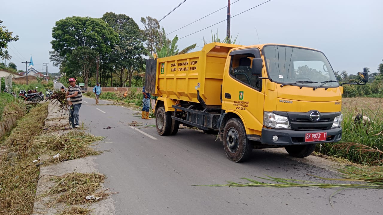 Tampak masyarakat mengumpulkan seluruh rerumputan yang telah dipotong untuk diangkut ke tempat pembuangan sampah akhir menggunakan truk pengangkut sampah.