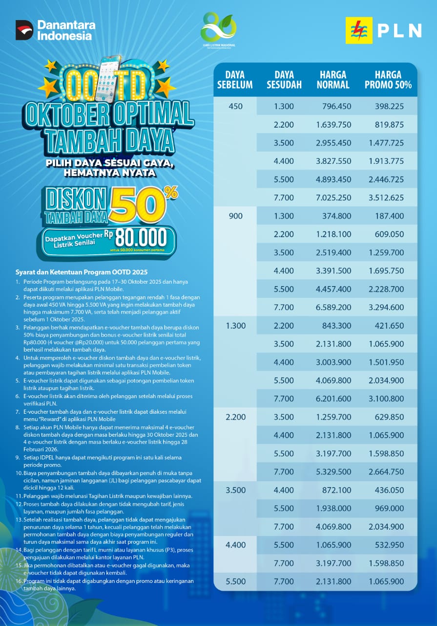 Promo ini dapat dinikmati oleh seluruh pelanggan tegangan rendah satu fasa di semua golongan tarif dengan daya awal 450 volt ampere (VA) hingga 5.500 VA, yang ingin menambah daya hingga 7.700 VA. Adapun ketentuannya yaitu telah menjadi pelanggan PLN sebelum 1 Oktober 2025.