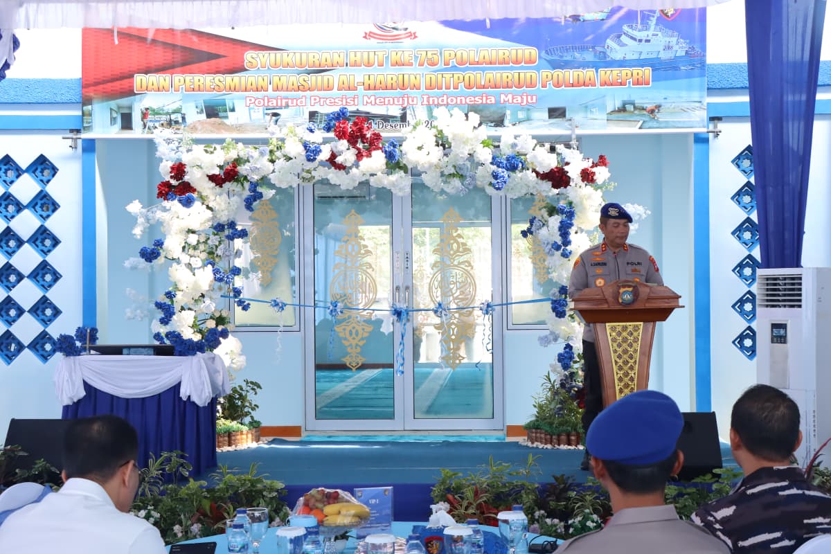 Acara berlangsung khidmat dengan rangkaian kegiatan mulai dari pemberian sembako, laporan Dirpolairud Polda Kepri, peresmian Masjid Al Harun, sambutan Kapolda Kepri, hingga sholat ghaib dan ramah tamah. Dirpolairud Polda Kepri Kombes. Pol. Handono Subiakto, S.I.K., S.H., M.H., menyampaikan bahwa tema HUT Polairud ke-75 tahun ini adalah “Polairud Presisi Menuju Indonesia Maju”, sekaligus melaporkan berbagai kegiatan sosial, program prioritas, penambahan sarana kapal baru, hingga keberhasilan pengungkapan kasus pencurian kapal asing yang mendapat apresiasi dari Pemerintah Singapura.