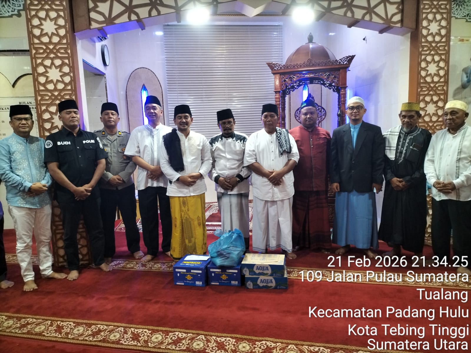Moranews Tebing Tinggi — Polres Tebing Tinggi turut berperan aktif dalam kegiatan Safari Ramadhan 1447 H yang digelar Pemerintah Kota Tebing Tinggi di Masjid Istiqomah, Jalan Pulau Sumatera Lk IV, Kelurahan Tualang, Kecamatan Padang Hulu, Kota Tebing Tinggi, Sabtu (21/2/2026) sekitar pukul 19.50 WIB.