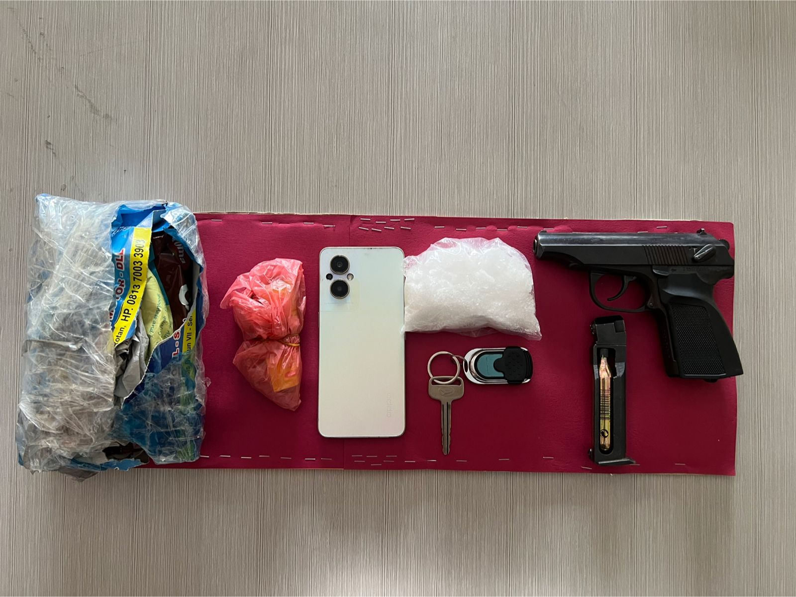 Selain sabu, turut diamankan sejumlah barang bukti lainnya, diantaranya satu unit handphone, satu unit mobil Daihatsu Xenia warna silver dengan nomor polisi BK 1004 HP, serta satu pucuk senjata genggam jenis airgun tipe MP-654K kaliber 4,5 mm lengkap dengan 15 butir amunisi dan tabung gas CO2, plastik asoy warna putih, roti roma kelapa dan potongan kertas koran.